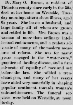 Mary Olney Brown’s written accounts of her experiences gained her notoriety within national movement, immortalized in the pages of Elizabeth Cady Stanton’s History of Woman’s Suffrage in the United States. Mary had accompanied Susan B. Anthony on her travels through the region in the fall of 1871, witnessing the cause be dealt blow after blow. The experience of permanent suffrage in the state was just 15 years outside of her mortal reach. But as she was a writer. Her legacy as part of the movement has secured her place in the story. Her description of events expressed the opposition that few had the fortitude or position to continually resist. Notably, she had the support of a marriage and the devotion of a husband that gave her a security not often experienced in her time.