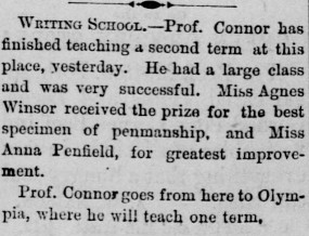 Seattle’s North School was one of three public schools serving a student population of 480.  North School, built on 3rd Ave and Pine Street, had two rooms to hold all the students that lived north of Cherry Street.  Agnes, with Miss Lizzie Clayton, had accepted a joint principalship of North school awarded by Professor Hall, who headed up University prior to the Hill’s arrival.  The youngest brother of Professor Hall was killed in a violent accident on the docks, marking his exit from education until 1874.[8] Hall was now superintendent in charge of Seattle Public Schools, while also being considered to head the expansion of Northern Pacific Railroad into Seattle.  So highly regarded, it was expected that he could negotiate both tasks simultaneously, better than any other could accomplish them alone.  Hall was egalitarian in his approach, expanding the scope of public education to include night school at the Central campus to better accommodate any who were interested in learning.  Courses were offered at a low cost, which could be awarded back for exemplary performance.[9]   Agnes was the recipient of one such prize, the award for best specimen in penmanship.